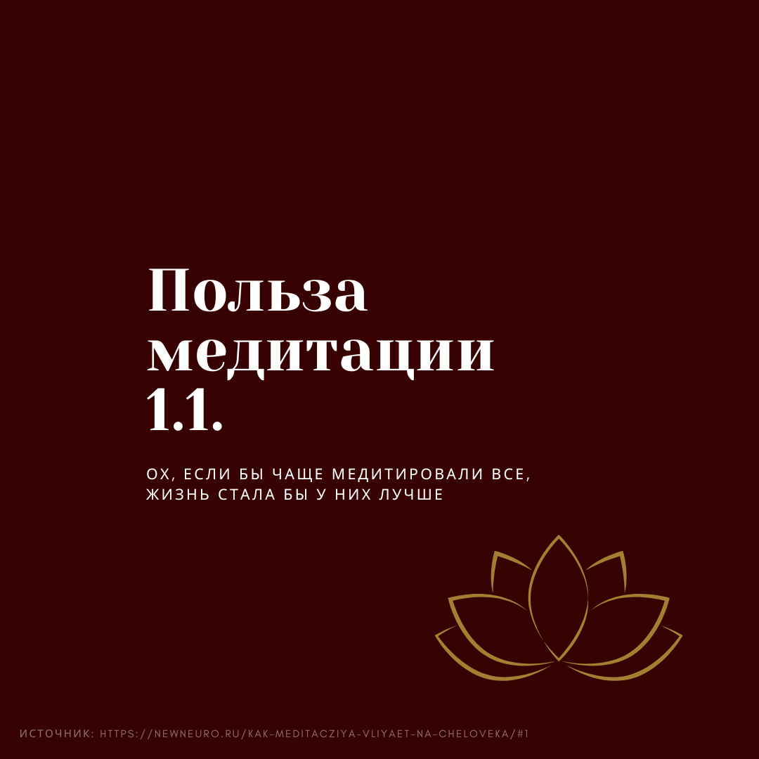 Польза №1 Польза №2 Польза №3 Польза №4 Польза №5 Даже 5 минут медитации в день даст вам пользу, а если медитировать по 20 минут в день на протяжении 3-6 недель, то вы заметите удивительные измнения в самоощущениях и в своём состоянии. Но так как не у всех может быть 20 минут на медитацию в день (хотя это на порядок лучше просмотра сериала перед сном), лучше находить и начинать хотя бы с 5ти минут.