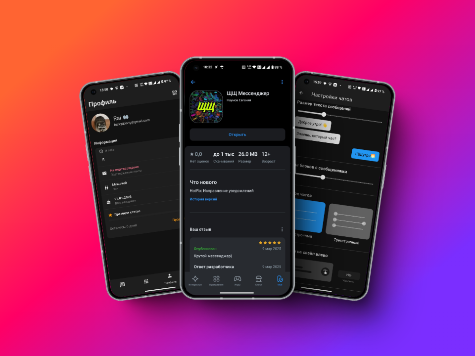 🎯 Хочешь быть в числе первых, кто тестирует мессенджер будущего? Мы создаем что-то особенное, и ТЫ можешь повлиять на его развитие прямо сейчас! 🚀 Что нового в версии 0.4.0? • Новые мини-приложения: - Цитатник – Вдохновляйся каждый день! - 2048 – Классическая головоломка теперь в чате. - Крестики-нолики – Играй с друзьями или против компьютера. - Генератор случайных чисел – Полезно для игр и розыгрышей. • Улучшения интерфейса: - Новый механизм свайпа для ответов. - Переработанный редактор обоев и emoji-picker. - Удобная поддержка ввода с клавиатуры в играх. • Функциональные плюшки: - Черновики сообщений для каждого чата. - Временное выделение сообщений при переходе. - Оптимизированная система прочтения. 🎁 Как получить premium-статус? Просто расскажи о нас в соцсетях! Создай пост или видео с хештегами #ЩЩ #ЩЩмессенджер, и каждую неделю мы будем выбирать победителя, который получит premium-статус на месяц. 👉 Скачать можно здесь: [ruStore](https://www.rustore.ru/catalog/app/com.shsh.m