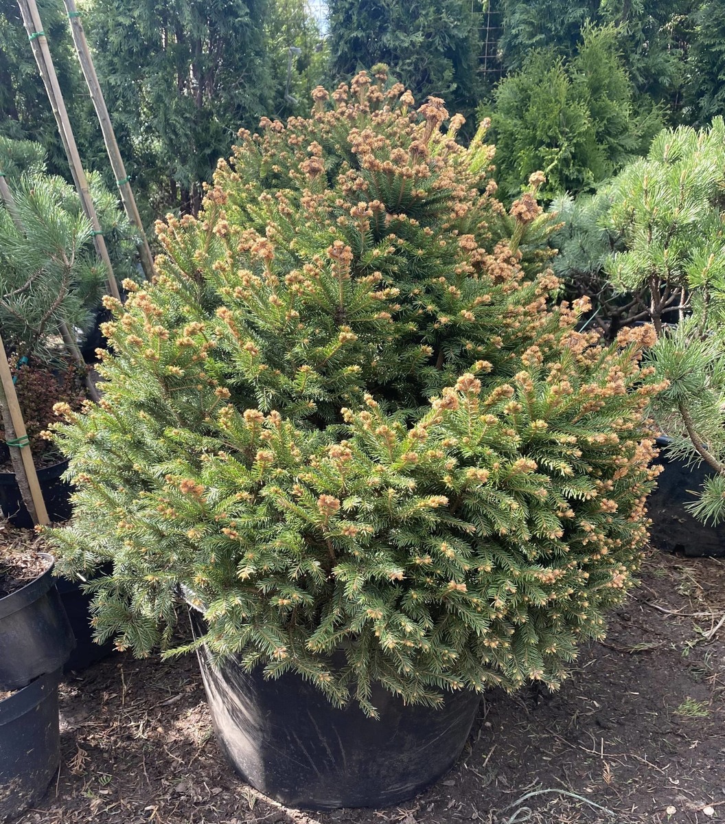 Ель Пигмея — очень декоративный сорт с плотной кроной, подходящий для одиночных и групповых посадок. Из-за своего размера он напоминает скорее хвойный кустарник, чем дерево. О других его свойствах — в нашей статье. Picea abies Pygmaea — низкорослый привитой сорт ели с короткими, часто посаженными побегами. За счет близкого роста ветвей у деревца формируется красивая и очень плотная форма кроны, близкая к конической. В условиях средней полосы разрастается до 2 метров в высоту и столько же в ширину. Однако растет медленно, по 3–7 см в год. За первые 10 лет обычно достигает лишь 40 см в высоту, поэтому елка больше похожа на куст, чем на дерево. Хвоя короткая и густая, темно-зеленая. Ветви растут строго перпендикулярно стволу, на их концах образуются небольшие шишки, меняющие окраску с фиолетовой на зелено-бурую по мере созревания. Обладает хорошей морозостойкостью — выдерживает температуры до –35…–40 градусов. Сорт Пигмея благодаря своей компактности подходит для небольших участков. Приме