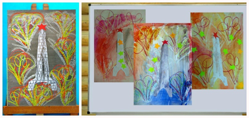 Вот такие получились подарки у моих малышей(3-4 года). В некоторых работах на салюте добавлены разноцветные звёздочки, это неожиданное решение возникло в процессе работы и весьма увлекло деток.