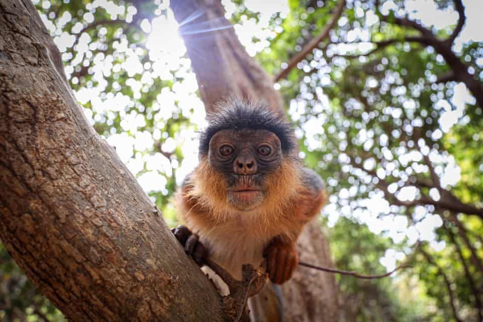 Красный колобус разглядывает свое отражение в объективе камеры в Гамбии. Фотоловушка или веб-камера? Колобус об этом не знает. Как и я. Теряюсь в догадках.