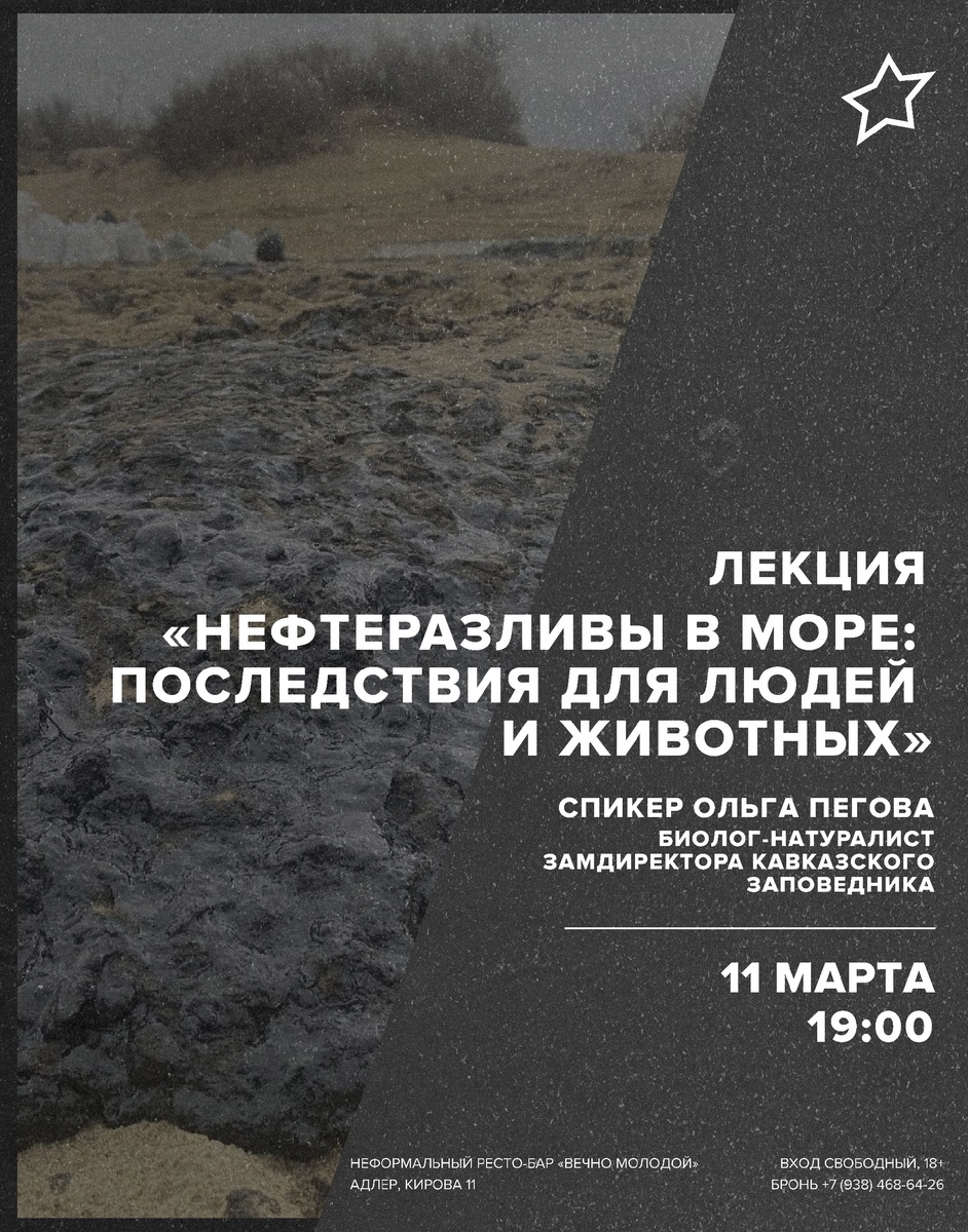 11 марта. Лекция «НЕФТЕРАЗЛИВЫ В МОРЕ: последствия для людей и животных» Спикер – Ольга Пегова, биолог-натуралист, замдиректора Кавказского заповедника Начало в 19:00, вход свободный 12 марта. Киноклуб. «Кролик Джоджо» Тайка Вайтити, 2019г, комедия / военный / драма Начало в 20:00, бронь места в кинозале 15 марта. Диджей-сет от Fillimonova Начало в 23:00, вход свободный 16 марта. Киноклуб. «Тёмный рыцарь» Кристофер Нолан, 2008г, фантастика / боевик Начало в 20:00, бронь места в кинозале Адлер, Кирова 11 Забронировать стол онлайн: vk.cc/cJjl5E или по телефону: +7 (938) 468-64-26