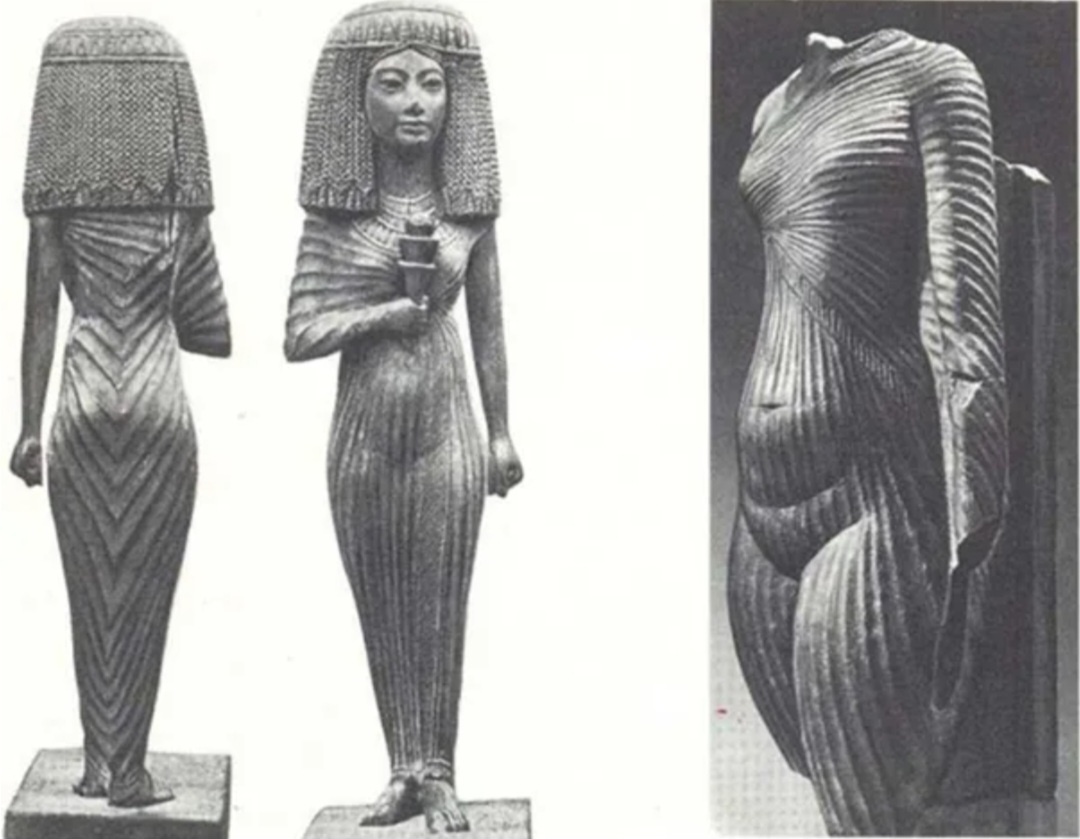 В моде времени правления последних фараонов XVIII династии (XIV в. до н. э.) Древнего Египта наблюдалось разнообразие и изощрённость в костюмах как для мужчин, так и для женщин. Преимущество отдавали тонким, прозрачным и упругим белым тканям, напоминающим газ, среди которых особенно выделялся легендарный виссон, упоминаемый в Библии как ткань, достойная Бога. Плиссировка и гофрировка позволяли добиться эффекта, когда прозрачность создавала иллюзию одетого и раздетого тела одновременно. Основными материалами для пошива являлись лен и шерсть. Из шерсти производили орнаментированную цветную тесьму с разнообразными рисунками. В Древнем Царстве предпочтение отдавали красному, зелёному и синему цветам. Со временем палитра обогатилась пурпуром всех оттенков, охрой, ярко-зелёным, чёрным и голубым. В древние времена популярными были гладкие однотонные ткани, однако с ростом стремления к роскоши стали использоваться узорные материалы. Эти ткани создавались как при помощи вышивки, так и с по