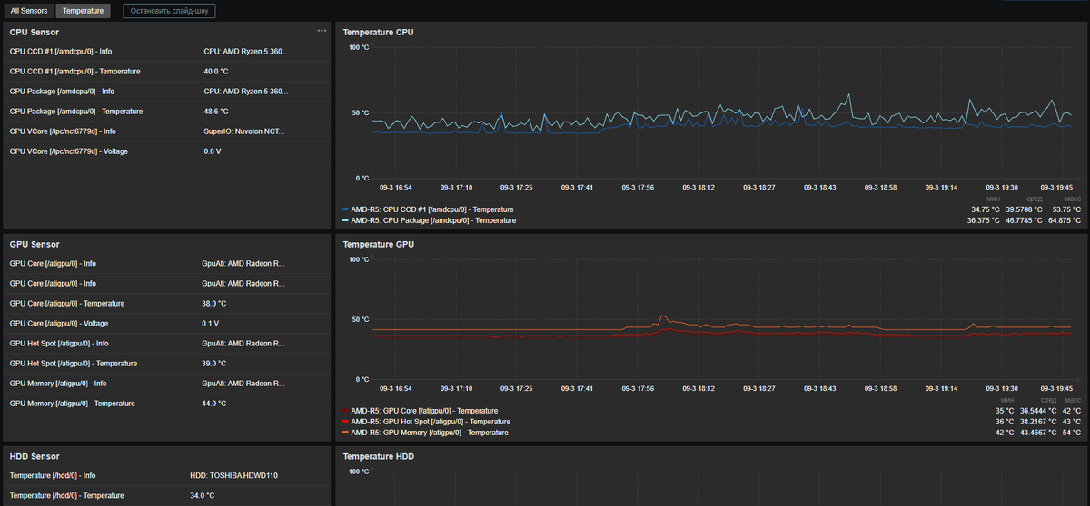Шаблона для Zabbix 7.2 и утилиту можно скачать у меня в группе вконтакте (ссылка) Сайт с инструкцией по установке утилиты Open Hardware Monitor (Скачать) Кратко о том как это работает. При старте компьютера запускается утилита Open Hardware Monitor и Zabbix agent. С помощью ключа wmi.getall[] агент получает список сенсоров и их значения которые обнаружила утилита. Данные передаются на сервер Zabbix. Сервер записывает их в свою базу данных и визуализирует. Используйте Панели узла сети для доступа к графикам как на скриншотах.