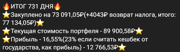 22.02.2025 года моему проекту исполнилось два года и это самое время подвести некоторые итоги. Как мы видим на скрине мною было инвестировано 73 100 рублей из личных средств, а также был получен от государства возврат налога в размере 4043 рубля, что дало 77034 рубля инвестиций. По итогу 21.02.2025 оценочная стоимость моего портфеля составила 89 900,58 рублей. Прибыль портфеля за период составила 16,55% (если считать возврат налога как инвестиции) или 23 % (если считать возврат налога как прибыль). Каждый может выбрать для себя более приемлемый вариант учета «кэшбека» от государства, но я считаю, что это должно относиться к прибыли, так как без открытия ИИС эти средства не оказались бы на моем счету. Ну что же, как оценить это результат? Он плохой или хороший? Для этого обратимся к причинам, условиям и правилам портфеля. Основным замыслом портфеля было создать такой портфель, чтобы при минимальных знаниях о фондовом рынке и торгуемых активах на нем получить рост на 3% в год выше офици