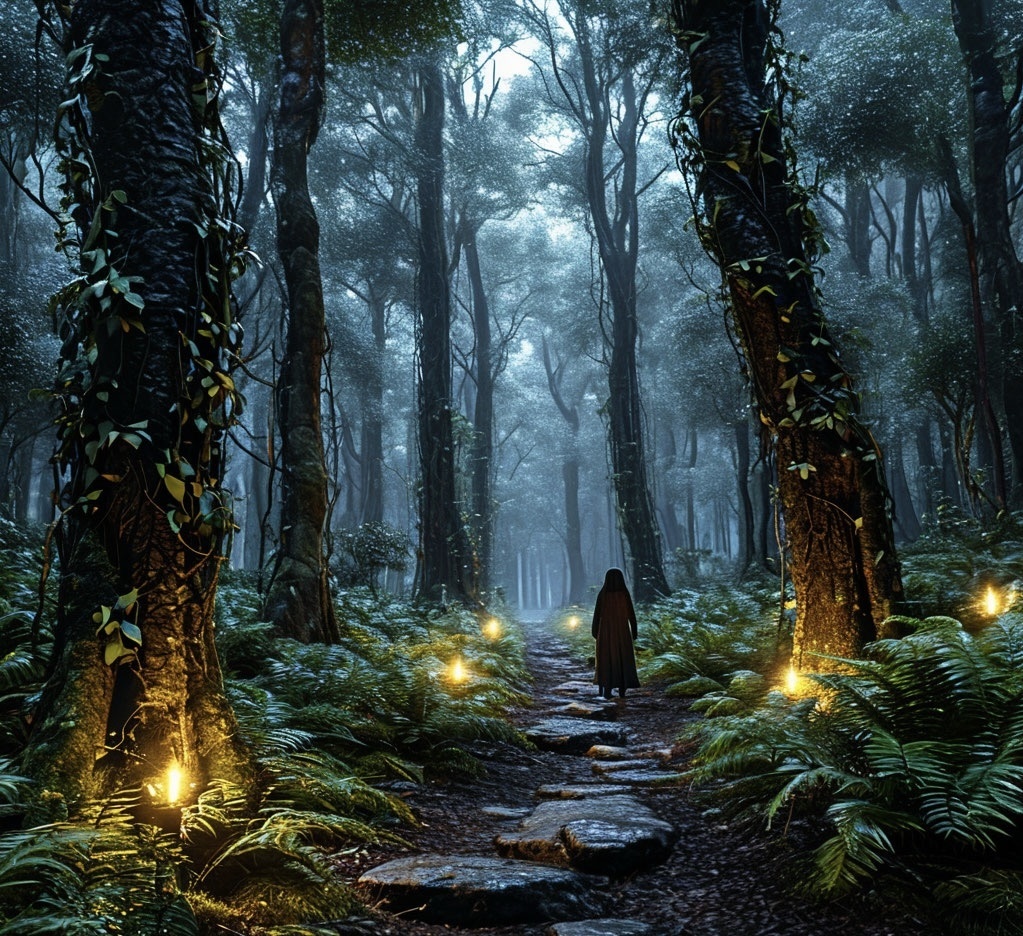 Когда солнце ушло, лес преобразился. Мы гуляли под звёздами — они были огромными, яркими, как фонари, и мигали в такт дыханию мира. Деревья засветились — их кора мерцала зелёным и синим, как в «Аватаре», а листья шептались, испуская крошечные светлячки. Тропинки покрылись мхом, что светился под ногами, и каждый мой шаг оставлял мягкое сияние. Кентавряша скакала рядом, её шерсть отражала звёзды, а Тиш носилась, ловя светлячков своим большим ртом.