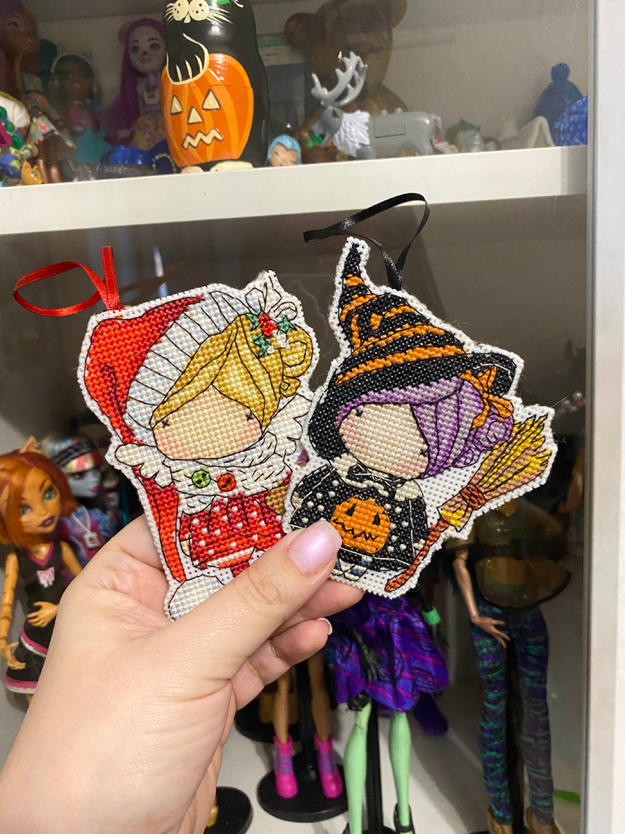 Итак, сегодня у нас понедельник, и мне хочется что-то выложить в блог, о чем-то интересненьком рассказать (тем более, что примерные планы по хобби я вчера накидала и наметила). Наметить наметила, но сделать ничего не успела. Даже голову клоунессы не дошила, хотя там осталось уже не слишком много. Честно признаться, она меня слегка утомила, как-то долго все это происходит, я уже хочу смены цветов и оттенков. Это, кстати, основная проблема появления у меня разнообразных «долгостроев» - я быстро перегораю, делая одно и то же. Поэтому всякие длительные проекты не для меня - я знаю, что обязательно устану и заброшу все на фиг. О чем я… о том, что сделать пока ничего не сделала, а рассказать что-нибудь хочется. И я решила показать вам куколок, которых сделала сама. Не слепила, не сшила, не скрутила, а вышила нитками мулине на пластиковой канве. Вот они, две мои красавицы - помощница Санты и ведьмочка: Вышивание - это тоже мое хобби, и я это занятие очень сильно люблю. У меня есть приличный
