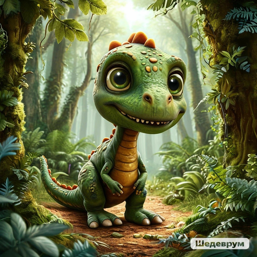 Жил-был на свете маленький динозаврик по имени Тим. Он был необычным динозавриком — не большим и грозным, а маленьким и очень любопытным. Тим жил в зелёном лесу, где росли высокие деревья, а вокруг цвели яркие цветы. Каждый день он выходил из своего уютного домика под большим камнем и отправлялся на поиски приключений. Однажды утром Тим проснулся и решил, что сегодня он найдёт что-то особенное. Он всегда мечтал найти волшебный камень, который, как говорили старшие динозавры, исполняет желания. Тим взял свою маленькую сумку, положил туда немного ягод на перекус и отправился в путь. Шёл он, шёл, и вдруг услышал тихий плач. Это была маленькая птичка, которая застряла в кустах. Тим сразу подбежал к ней и осторожно помог выбраться. — Спасибо тебе, Тим! — чирикнула птичка. — Ты такой добрый! Что ты ищешь? — Я ищу волшебный камень, который исполняет желания, — ответил Тим. — О, я видела его! — сказала птичка. — Он лежит на вершине высокой горы, но туда трудно добраться. Я покажу тебе