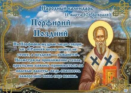 11 марта. Порфирий. Порфирий Поздний. Птичий день. В этот день Православная Церковь почитает святителя Порфирия, архиепископа Газского(† 420). ❇️ПРИМЕТЫ ✔️Дождь на Порфирия - к доброму лету. ✔️Облака высоко плывут - к ясной погоде. ✔️Если ночью небо ясное и звездное, лето будет жарким и грозовым. ✔️Утром туман - к непогоде, вечером - к теплу. ✔️Дует южный или юго-западный ветер - к оттепели. ✔️Если птицы вьют гнезда на солнечной стороне, лето будет холодное; на теневой - жаркое. ✔️Выпавший в этот день снег скоро растает; он предвещает холодное и сырое лето. ✔️Воробьи в стаи сбиваются - к солнечной и сухой погоде. ✔️Голуби воркуют, вороны кружат над головой - к теплу. ❌ЧТО НЕЛЬЗЯ ДЕЛАТЬ ✔️Нельзя стричься, иначе волосы будут плохо расти, начнут выпадать. ✔️Не заключали в этот день браки, потому что семья, по поверью, быстро распадется. ✔️Не занимались рукоделием, чтобы беды к себе не пришить. А узлы на нитках предвещали неприятности, препятствия и денежные проблемы. ✔️Не оставлял