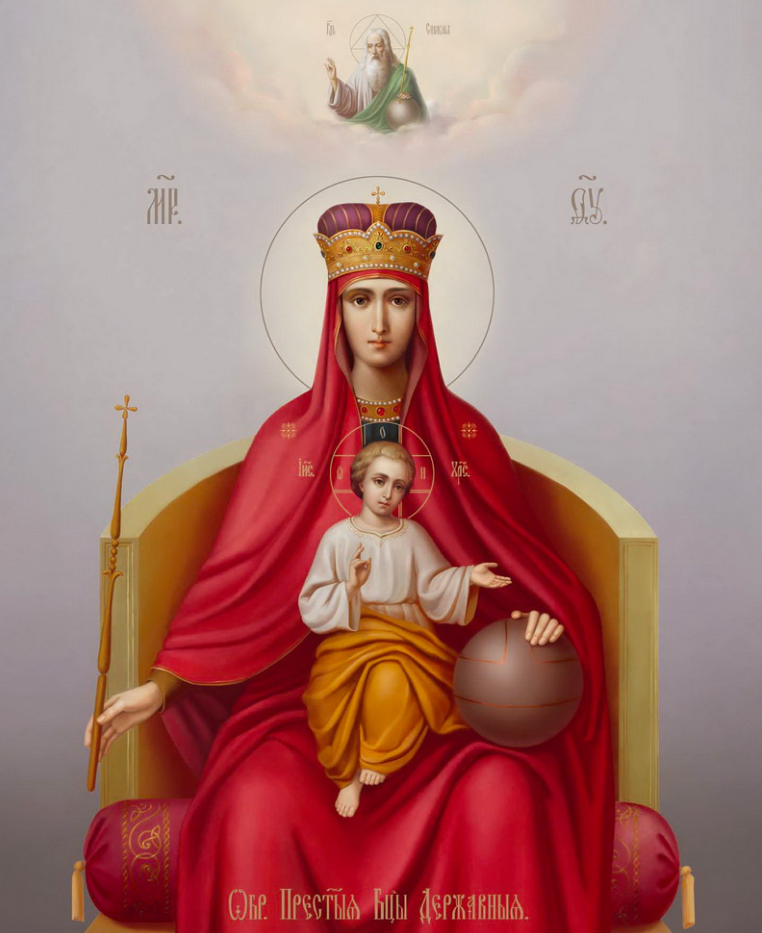 Старых икон в подполье храма было много, и Евдокия нашла среди них один почерневший образ, на котором читался вид Богоматери, восседающей на престоле и держащей на руках Младенца. На главе и в руках у Матери Божьей были императорские регалии – венец, скипетр и держава.