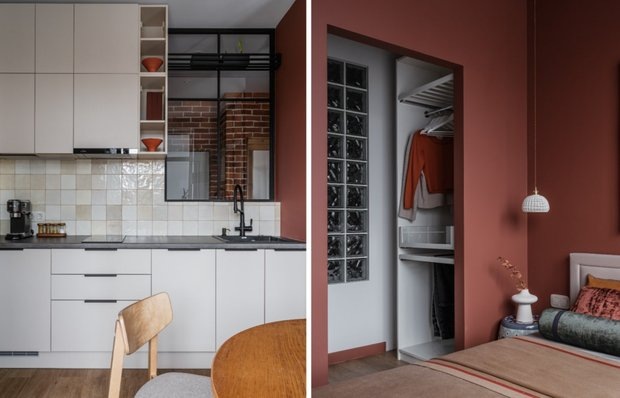 Классные идеи для малогабаритки Маленькие квартиры могут быть не только функциональными, но и стильными. С помощью грамотной планировки и красивого дизайна можно создать уютное и оригинальное пространство, где комфортно жить и приятно принимать гостей. Вот пять интересных идей из однушки, оформленной по проекту Павла Баканова. Оригинальным акцентом в кухне стало окно над мойкой. Оно выполняет эстетическую функцию, визуально расширяет пространство и позволяет естественному свету проникать в прихожую, превращая небольшое помещение на входе в более уютное и светлое. Это идеальное решение для крошечных квартир, где важно максимально использовать каждый квадратный метр. Стеклянная перегородка между спальней и основной комнатой создает стильное и современное решение для малогабаритки. Она позволяет разделить пространство, не теряя при этом света и ощущения простора. Такой подход подходит как для студий, так и для квартир с отдельной спальней. Для отделки стен и потолка в спальне использован