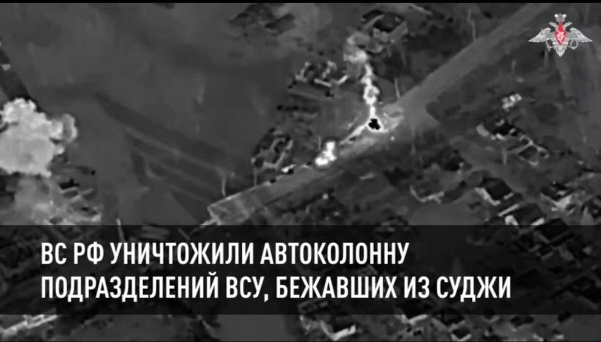 По информации «Русского оружия, военные РФ нанесли удар по откатывающейся по шоссе 38К-004 из оставленных пунктов дислокации в Судже. Колонна ВСУ двигалась в направлении российско-украинской границы и города Сумы через Юнаковку. На кадрах видно как более пяти бронеавтомобилей были сожжены сбросами с дронов. Автор обращает внимание, что оснащённый тепловизионным датчиком наведения и радиокомандной системой управления и передачи инфракрасного видиеоизображения FPV-дроноказывается в радиусе действия мощных комплексов РЭБ, установленных на технике противника. Но российским операторам дронов удалось выполнить поставленную задачу, несмотря на помехи. Подчеркивается, что в разгроме колонны были задействованы и помехозащищённые оптоволоконные FPV-коптеры.
