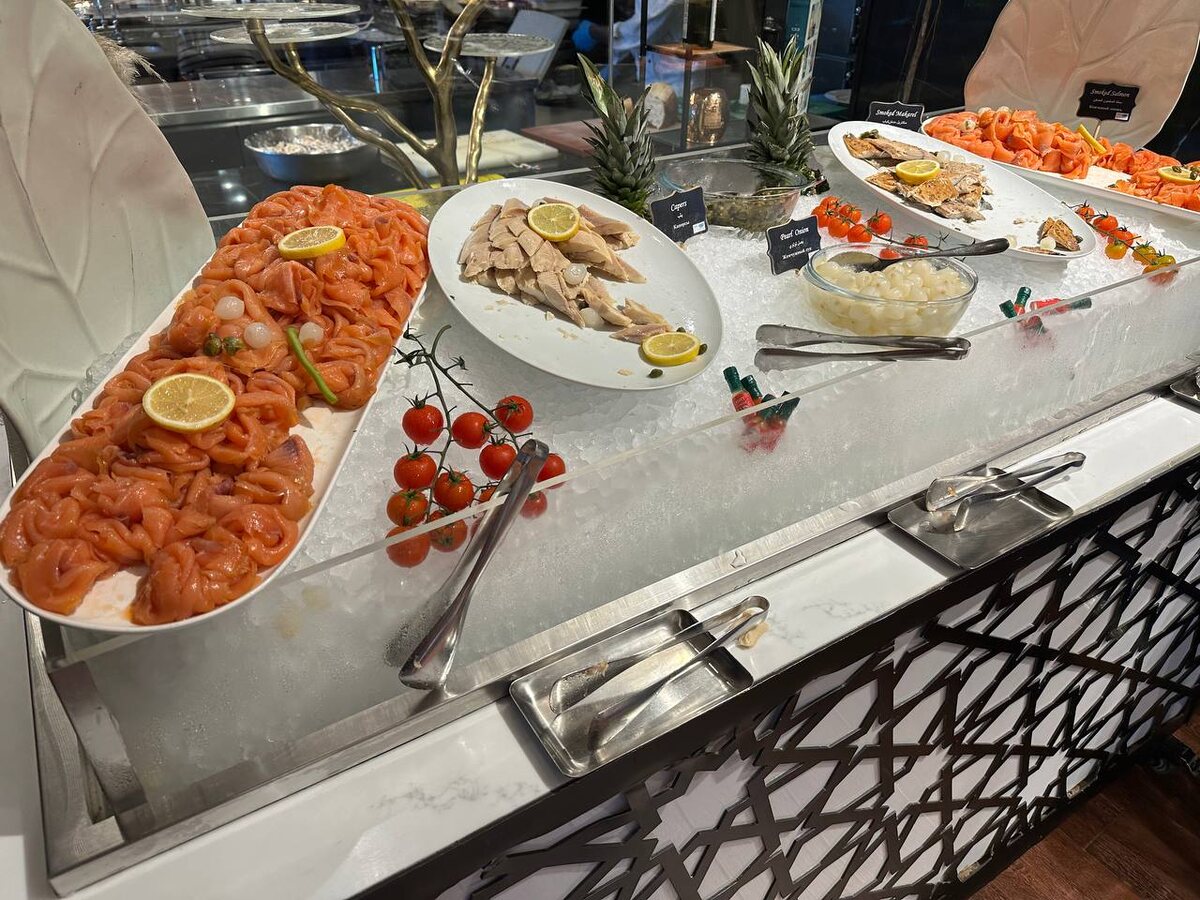 Красная рыба была в большом количестве каждый день, хорошие жирненькие куски. Я брала её постоянно, наелась на год впёред. Также всегда была белая рыба холодного копчения, но я не большой ценитель. Здесь же всегда стояли миски с каперсами и маринованными луковками.