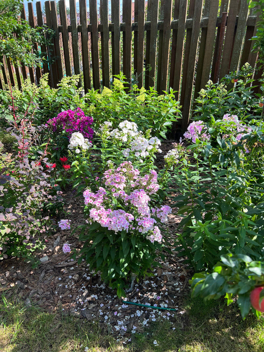 Наверное, и советовать не надо фотографировать сад летом. Свои красивые цветочки и кустики, да и общие фото цветников тоже крайне полезны. Мало того, что мы любуемся ими зимой, планируем переделки и видим то, что не замечаем в сезон, летом. Весной все лысое, многолетники спят и кажется, что все хорошо, пусто, ничего друг другу в клумбах не мешает. Каждую весну смотрю и думаю - вроде всё на местах, все нормально… а вот нет. Я уже осенью начинаю писать список недоработок - что пересадить, что разрядить и куда что убрать, а на это место посадить, иначе половину задумок забуду весной благополучно. И все это понадобится, когда многолетники разрастутся и начнут закрывать друг друга и мешать. Вот например в этой композиции. Вроде все цветёт и пахнет Но флоксы уже выросли так высоки и широко, что за ними, а там еще есть растения, которые совершенно потерялись за высокими флоксами - Пенстемон Мистика, маленькая Астильба и Хоста. Надо спасать весной. Разрослись барбарисы, Монарда стала еще выш