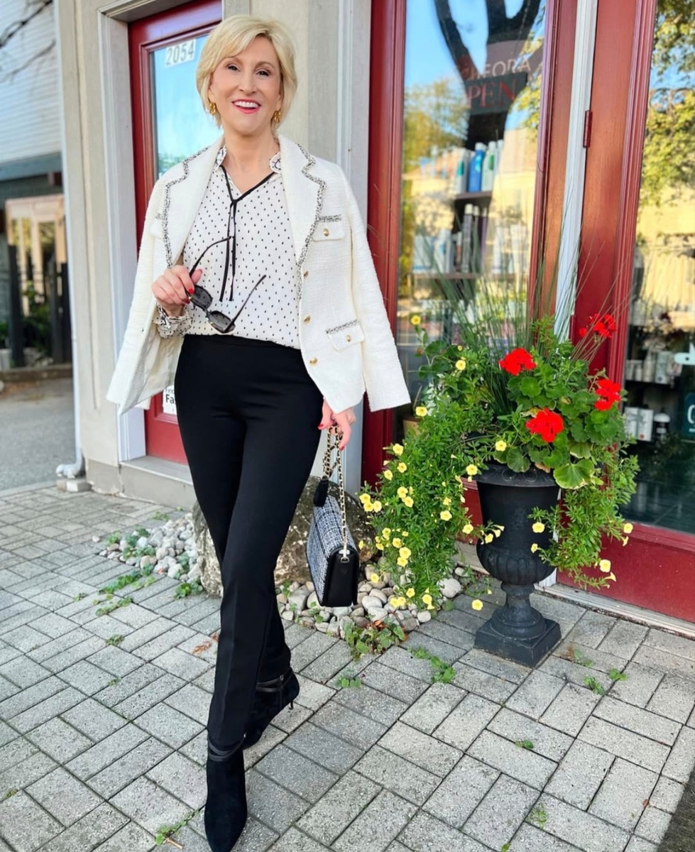 Давайте будем честными: какой-то особой моды для женщин «слегка за» не существует. Не всем нравится оверсайз, не для всех подходит классический стиль в одежде. Одеваться нужно так, как нравится именно вам и в то, что по-настоящему подходит. При этом не стоит отказывать себе в удовольствии пробовать новые оттенки, фактуры и фасоны. Для этого и существуют примеры и подборки, которые помогут определиться с тем, во что хочется облачиться этой весной. Ведь правильный образ способен изменить облик до неузнаваемости! В сегодняшней публикации предлагаю вам посмотреть на красивые и разноплановые ансамбли от модниц 50+. Тренируйте насмотренность и выбирайте для себя подходящий стиль на эту весну. Невероятно элегантный и удачный комплект для работающих леди. Классические брюки, подчеркивающие силуэт, прекрасно сочетаются с воздушной блузкой с ненавязчивым принтом. Для верхнего слоя подойдет женственный твидовый жакет, а в качестве обуви — замшевые ботильоны. Светлые оттенки у лица освежают и ом