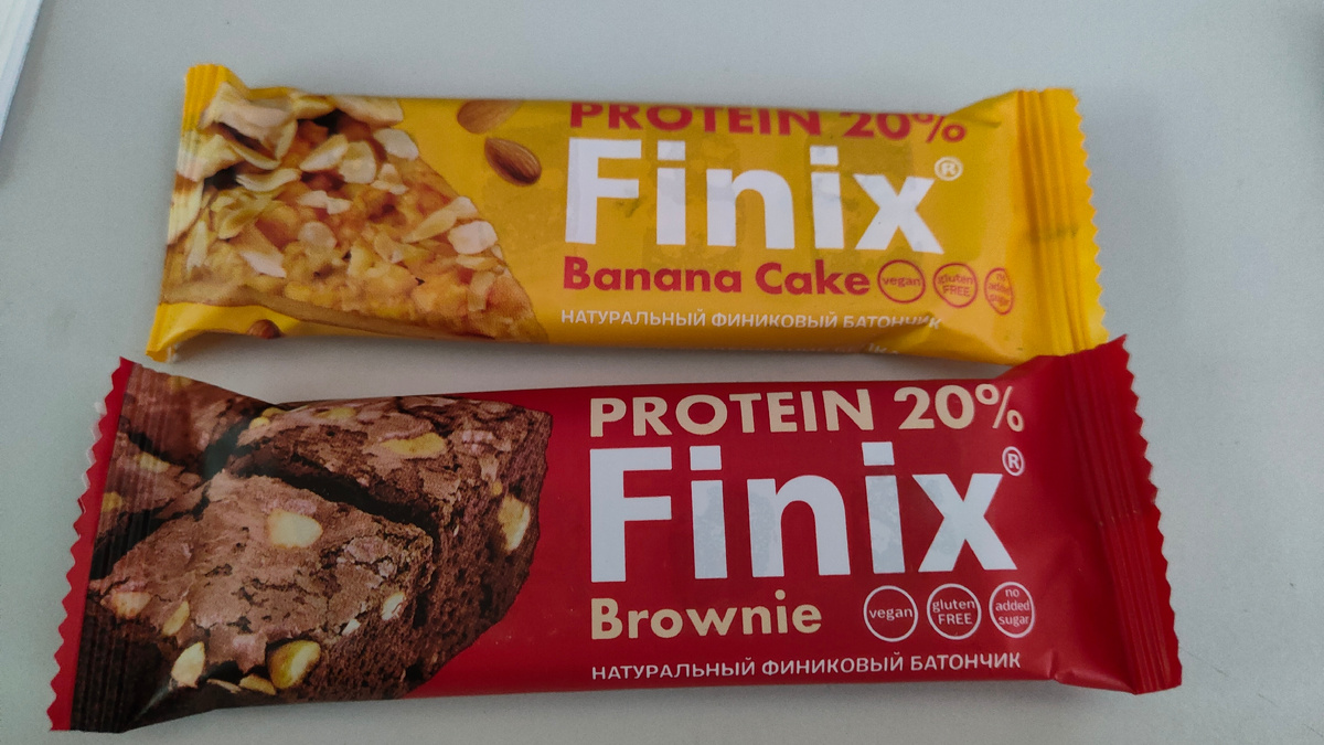 В данной статье я рассмотрю финиковые батончики от фирмы "Finix". Попались они мне в сети магазинов "Магнит", так как они были по акции отдал за каждый примерно 50 рублей, к сожалению не запомнил сколько они стоят без скидки, но примерно за эту цену из можно найти на любом маркетплейсе. 1.финиковый батончик с протеином, арахисом и какао "Брауни". Состав: финик, арахис обжаренный, смесь растительных белков(соевый белок, гороховый белок), концентрированный яблочный сок, какао-порошок, масло кокосовое рафинированное дезодорированное. Содержит только натуральные сахара! По составу все отлично, он краток и чист, а следовательно никакой лишней химии. Ну я финики не особо люблю, но здесь только его послевкусие прослеживается, в первые минуты при первом укусе, я даже бы не сказал, что данные батончики деланы из фиников. Внешне батончики состоят из четырех кубиков, чтобы из удобнее было делить. Темного цвета батончик с добавлением арахиса, что заметно невооружённым взглядом. Изначально слад