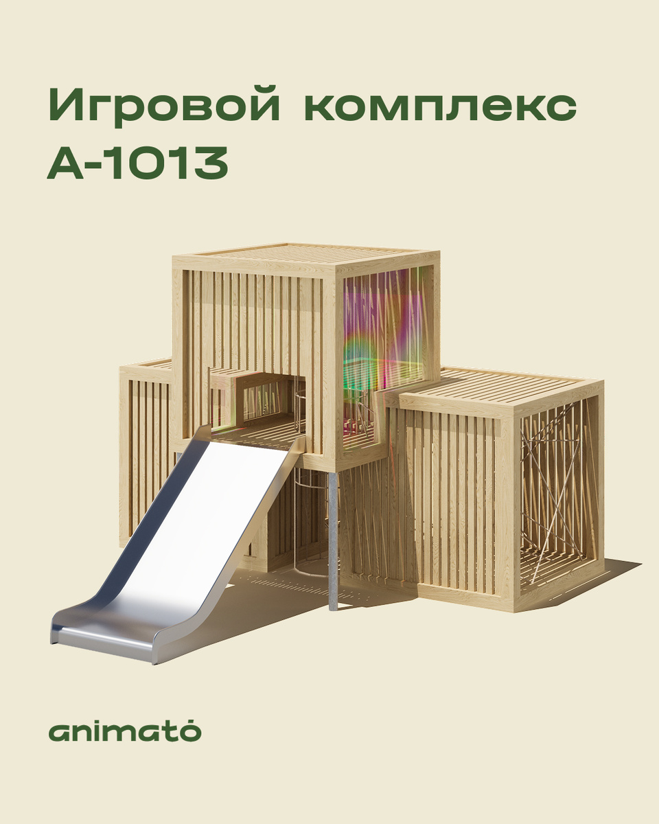 Комплекс А-1013 подходит для детских ролевых игр. Три деревянных куба — идеальные места для уединённых занятий. А радужные панели наполняют пространство разными цветами в солнечную погоду и создают волшебную атмосферу внутри. Дети могут карабкаться по вертикальной лесенке, прятаться внутри и придумывать новые сценарии игр. Сегодня — штаб исследователей, завтра — средневековый замок или тайное убежище. А спуск с горки станет финальным штрихом любого приключения. А-1013 дополнит экстерьер любого ЖК. Нужны детали? Пишите нам, а мы проконсультируем и ответим на все вопросы.