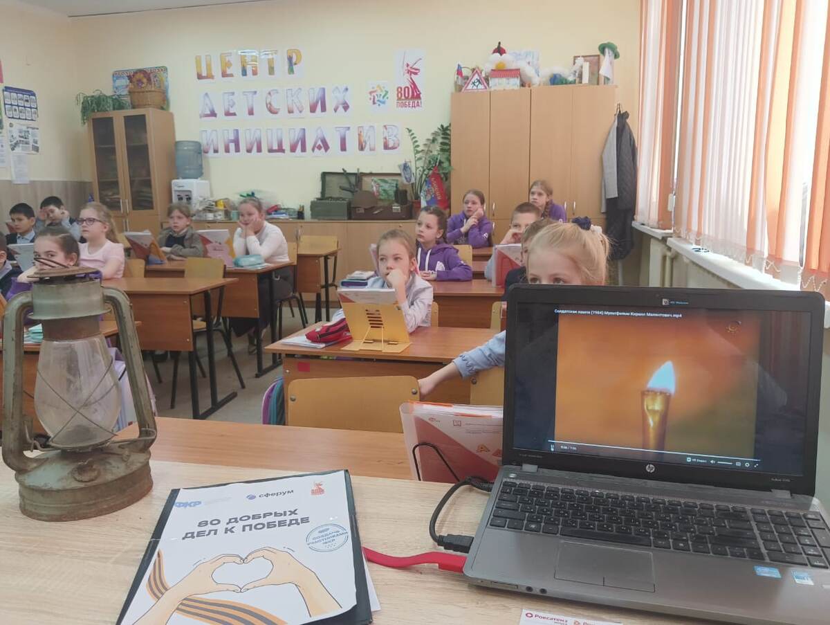 Команда "Орлята России" предложила ученикам начальных классов посмотреть мультфильм "Солдатская лампа" с последующим обсуждением.