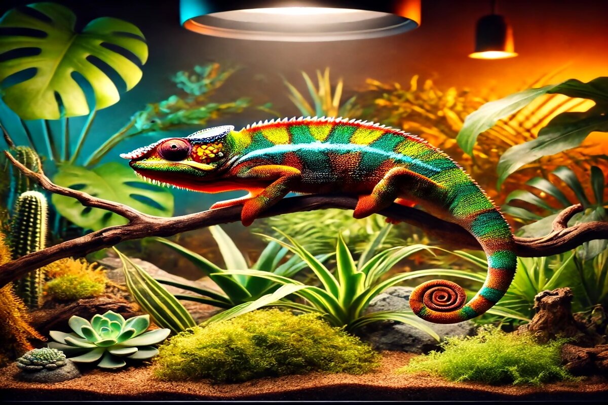 • Условия содержания: Чтобы ваш хамелеон чувствовал себя комфортно, ему необходим просторный террариум с хорошей вентиляцией и влажностью 50-70%. Температура должна варьироваться от 25°C до 30°C, а для прогрева в террариуме можно установить участки с температурой до 35°C.
