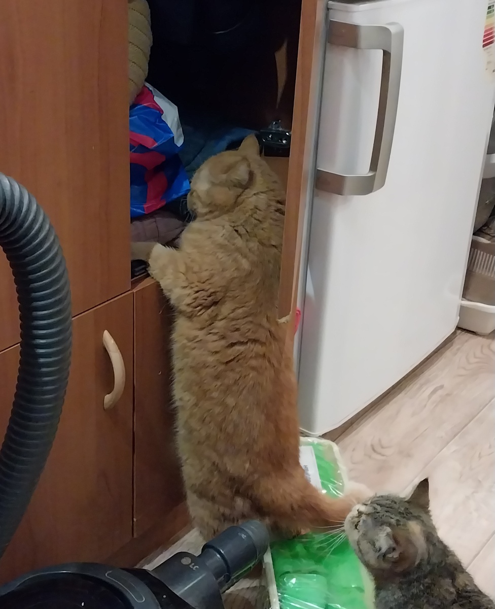 Саймон, возмущаясь, роется в шкафу: - Бардак! Кругом бардак! Понаставили тут своих рассадников! - Чего ищешь? - спросила Девочка. - Пакетик мой со вкусняшками, я его сюда вчера положил. Сокрушается Саймон, проверяет пакеты, старые штиблеты 😹 - Прям, вон туда положил, чтобы сразу всё не слопали! - Тогда ищи давай скорее, - подгоняет Девочка. - Да ищу я, ищу! Надо человекам сказать, чтобы получше тут прибирались, - сказал Саймон. И тут слышится голос Сони: - Эй, ребята! Не там ищите-то! Я давно вкусняхи перепрятала! А половину себе в животик, — так надёжнее. Соня, беги!😹