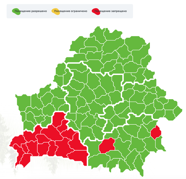 В 18 районах Беларуси запрещено посещать леса. Это следует из данных интерактивной карты Министерства лесного хозяйства. Так, запрещено посещать лес в Барановичском, Березовском, Брестском, Ганцевичском, Дрогичинском, Жабинковском, Ивановском, Ивацевичском, Каменецком, Кобринском, Лунинецком, Ляховичском, Малоритском, Пинском, Пружанском, Столинском Брестской области. Также запреты введены а Ветковском и Петриковском районах Гомельской области. В Минлесхозе обращают внимание, что обстановка в лесном фонде в течение дня может меняться, соответственно, и карта с запретами и ограничениями на посещение лесов тоже будет претерпевать изменения.