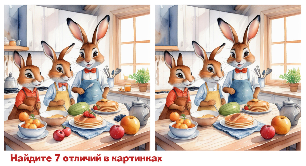 Как говорят пекари: «Блины любят заботу, а тесто — точность. Иначе получится либо оладушек, либо недоразумение.» Зайцы решили испечь блины к завтраку. Тесто получилось отменное, блины румяные, ягодки свежие — красота! Но стоило папе-зайцу попробовать первый кусочек, как он замер, медленно прожевал и посмотрел на детей: «Кто насыпал в тесто морковку вместо муки?» Найди 7 отличий и помоги сохранить идеальное утро. Горизонтальная картинка: Вертикальная картинка: Отличная работа! Ты внимательная и очень сосредоточенная. Пусть каждый день приносит что-то хорошее. До новой встречи!