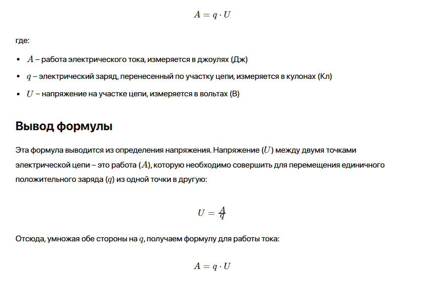Работа электрического тока на участке цепи определяется как работа, совершаемая электрическим полем при перемещении электрического заряда по этому участку. Работа тока (AAA) выражается следующей формулой: Другие формулы для работы тока Работа тока – это физическая величина, характеризующая энергию, затраченную на перемещение электрического заряда в цепи. Ее можно выразить через различные параметры цепи, такие как заряд, напряжение, сила тока, сопротивление и время.