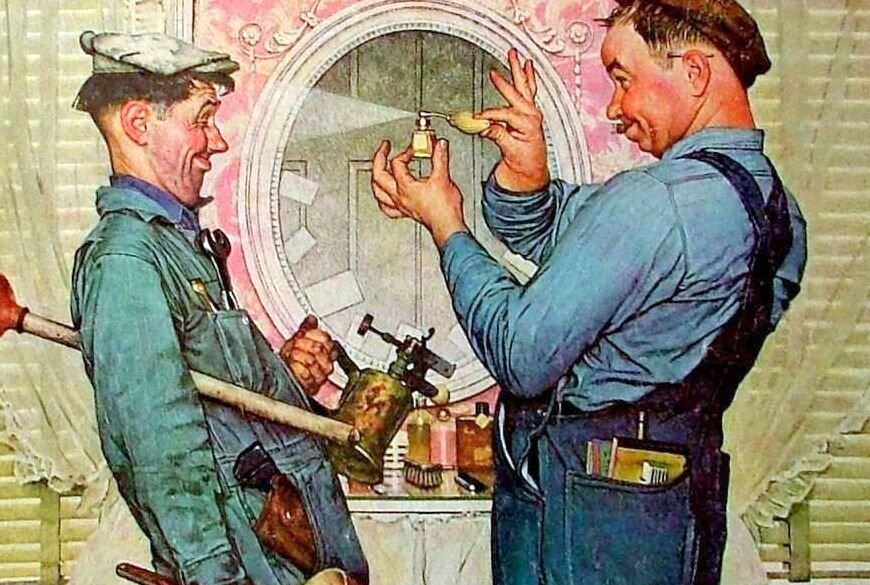 На этом полотне, как вы отметили, запечатлена непринужденная атмосфера, где два сантехника, казалось бы, пришли выполнять свою работу, но в итоге отвлеклись на более легкомысленные занятия. Их поведение подчеркивает некоторую юмористическую сторону повседневной жизни, зафиксированную Роквеллом. Каждая деталь на картине, включая выражения лиц и жесты героев, рассказывает о легкомысленном отношении к ситуации, что не может не вызывать улыбку у зрителя.