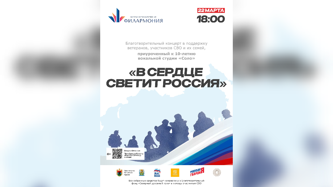 Он состоится 22 марта в Карельской государственной филармонии в Петрозаводске. Начало – в 18 часов. Все полученные от продажи билетов средства направят на приобретение предметов первой необходимости для военнослужащих из Карелии, принимающих участие в специальной военной операции. 22 марта 2025 года в 18.00 часов в Карельской государственной филармонии в Петрозаводске пройдет благотворительный концерт в поддержку ветеранов, участников СВО и их семей, приуроченный к 10-летию вокальной студии «Соло» «В сердце светит Россия». Со сцены прозвучат патриотические песни. Билеты можно приобрести на сайте филармонии. Все собранные средства направят в благотворительный фонд «Северный духовный путь» для оказания помощи бойцам из Карелии, выполняющим боевые задачи в зоне проведения СВО. Концерт проводится при поддержке Правительства Республики Карелия, Карельского регионального отделения Партии «ЕДИНАЯ РОССИЯ», Карельского регионального отделения «Молодой Гвардии Единой России», Центра народного тв