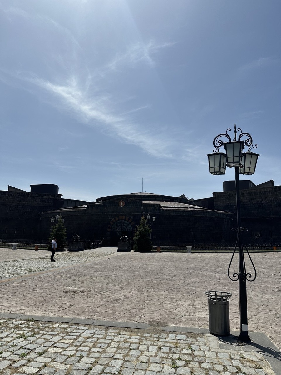 Примерно в 120 км от Еревана в центральной части Ширакской котловины, окруженной хребтами и отрогами горного массива расположился город Гюмри. В 1988 году в соседнем с ним городе Спитаке произошло чудовищное землетрясение, которое, естественно затронуло и Гюмри. Практически все постройки выше 3 этажей были разрушены. Как говорят армяне – было разрушено советское наследие и осталась классическая армянская архитектура. В город можно добраться на поезде (3,5 часа езды), на автобусе и на машине. Мы арендовали машину с водителем (можно договориться на рецепции отеля). За четверых мы отдали порядка 8000р.за весь день. Итак, первым делом отправляемся к Черной Крепости-крепость Российской Империи, построенная в 19 веке для обороны от турков: В серьезных боях никогда не участвовала, хотя наш гарнизон находился там длительное время. К слову, рядом же располагается современная база ВС РФ. - Родина-мать Армения в Гюмри. Находится там же рядом с Крепостью и является аналогом памятнику в Ереване: -