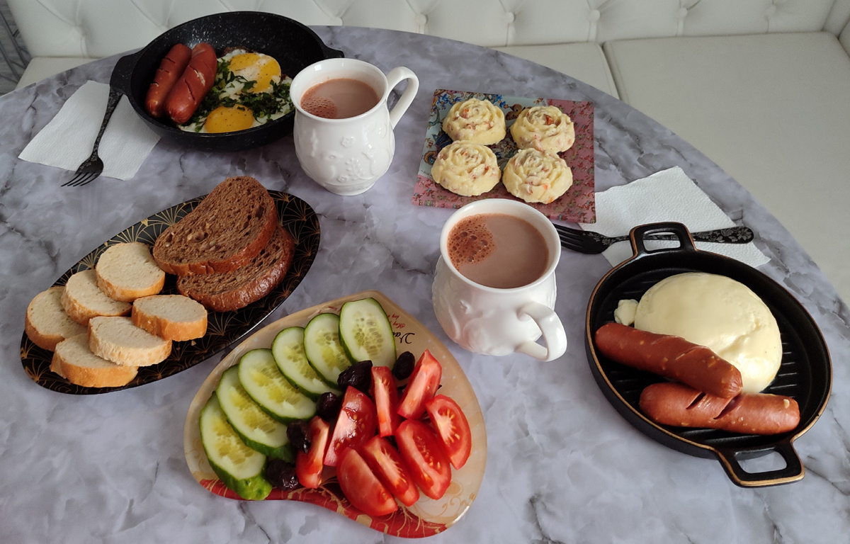 Налила нам с ней по кружке какао с молоком, порезала хлеб и багет, на всякий случай поставила ещё и тарелочку с варениками, и мы сели трапезничать.
