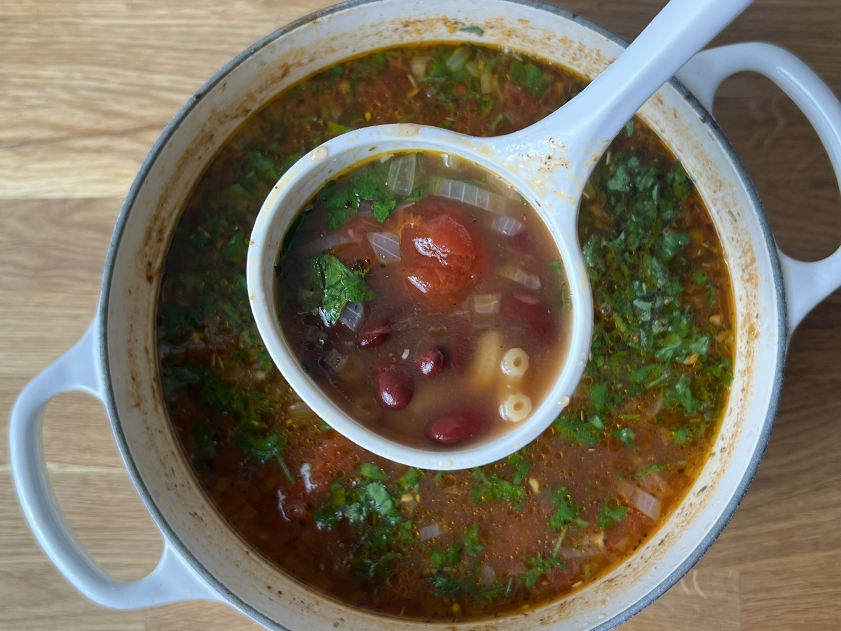 Много чеснока, красный перец и орегано создают насыщенный вкус блюду. Имея уже готовый куриный бульон, вам понадобится всего полчаса, чтобы приготовить сытный обед. Не смотря на то, что фасоль уже готовая в консервированном виде, в рецепте я добавляю её в начале приготовления, так она становится только вкуснее. Для большей сытности и вкуса перед тем, как обжаривать лук, можно обжарить 100 грамм бекона или фарша говяжьего. Масло для жарки – 2 ст.л Лук – 1 шт. Чеснок – 6 зубчиков Орегано – ½ ч.л Красный перец хлопьями – ½ ч.л Томаты в собственном соку – 1 банка (500-800 гр.) Куриный бульон или вода – 1 л Фасоль консервированная – 2 банки Лавровый лист – 2 шт. Паста – 150 гр (примерно 1 чашка) Петрушка – 5 веточек Оливковое масло для подачи Вылейте банку с помидорами в миску, каждый помидор можно сжать руками, чтобы получились небольшие кусочки, либо порезать на доске на кусочки. Оставьте. Нагрейте масло в кастрюле (у меня чугунная кастрюля, поэтому я сразу всё обжариваю в кастрюле, если