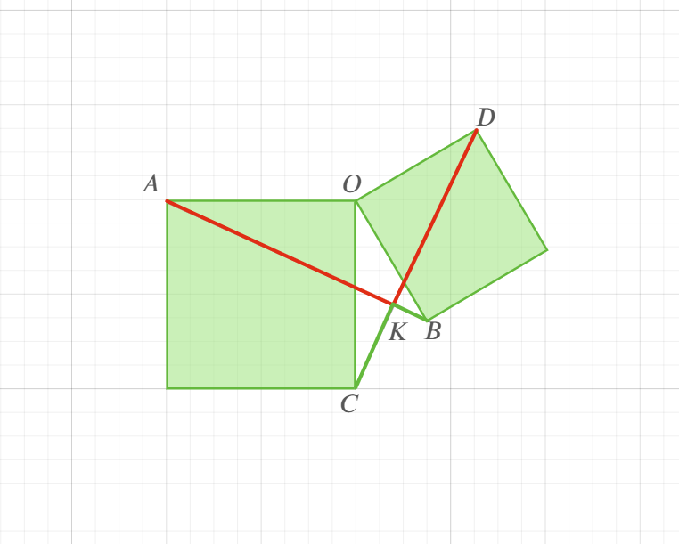19. ★★★ Два квадрата имеют общую вершину O. Отрезки AB и CD , соединяющие их вершины, пересекаются в точке K. Известно, что AO>DO. Что больше: AK или DK ?