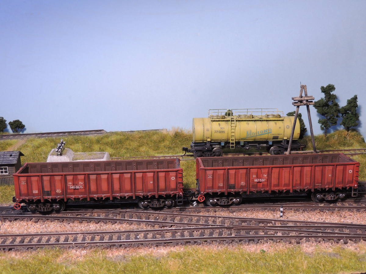 Очередной, двадцать восьмой по счету, выпуск обзора интересных моделей будет посвящен работам одного мастера - Михаила Борзыкина. С предыдущими подборками интересных моделей грузовых вагонов и другого подвижного состава можно ознакомиться по ссылке ниже (или в конце статьи): А в этом обзоре мы рассмотрим подборку грузовых вагонов в масштабе 1:87, выполненных в реалистичном стиле, с нанесенными следами эксплуатации, сфотографированными на тематически созданной диораме. Автор: Михаил Борзыкин Пара вагонов 12-532 раннего выпуска с корытообразными выштамповками на кузове построена из наборов для самостоятельной сборки производства SIN models. Окраска моделей произведена автоэмалями с применением техники модуляции и прешейдинга, тонировка выполнена художественным маслом на уайт-спиритовой основе, акварельными карандашами и акрилами от "Пасифика". Автор: Михаил Борзыкин Следующая группа полувагонов изготовлена из наборов для самостоятельной сборки производства ТО СВРЗ. Технология окраски б