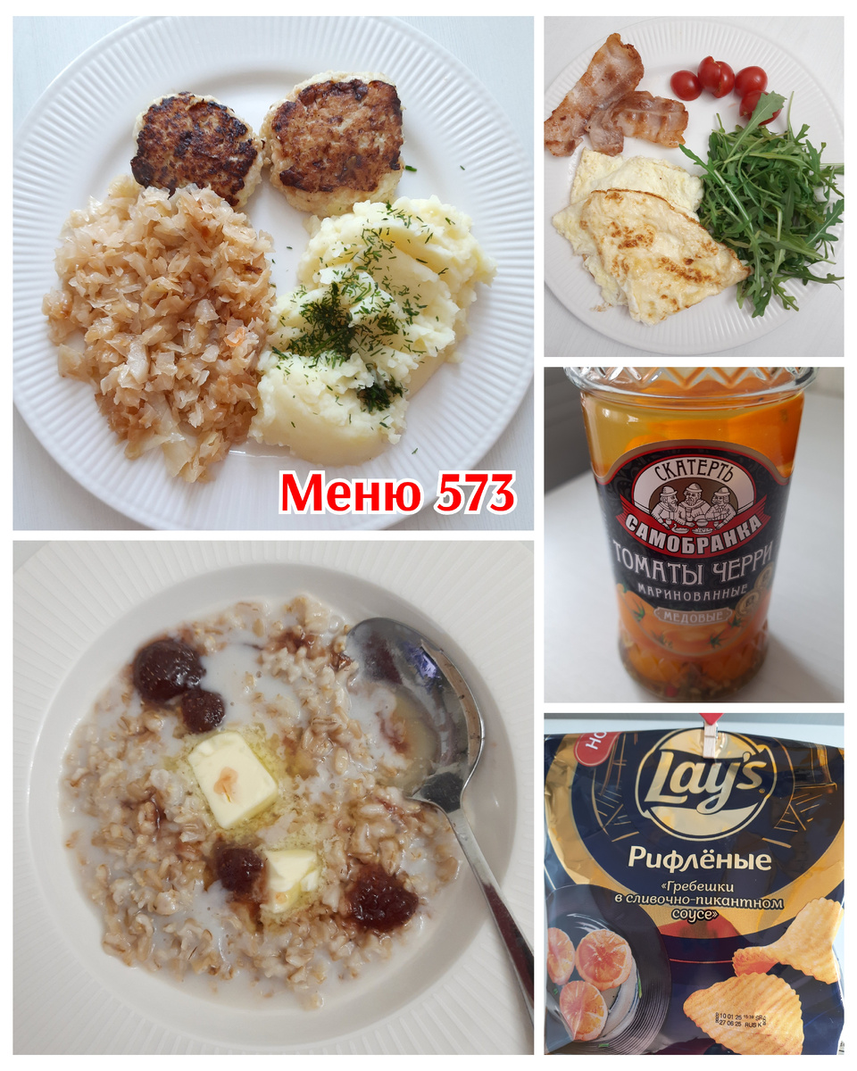 #Завтрак – на один из завтраков была каша! Овсянка на молоко-воде. Со сливочным маслом и домашним клубничным вареньем. #Обед – пюре с молоком и маслом. Потушила капусту на рассоле от домашнего Ассорти. Рыбные котлетки. Фарш трески Borealis из Ленты. Неплохой. Но все же 2 крупные косточки попались во время пережевывания. Фото упаковки нет. Смешала готовый фарш с измельченной луковицей. Добавила соль, перец, немного перемолотых чесночных стрелок и пару ложек муки. Мокрыми руками сформировала котлетки. Обжарила на топленом масле. Котлеты не особо держат форму, так как ничего сцепляющего в них нет. Поэтому нужно жарить до корочки. Так и вкуснее. И не совсем рыхлые будут. Зато получилось нежно и сочно. #Ужин – обжариваю на сковороде бекон, затем на оставшемся жире готовлю омлет. Руккола, помидоры черри. Вот такие томаты взяла в Пятерочке по акции. Скатерть-самобранка 580 мл за 114,63р. Очень вкусные. Сладкие. Ну еще бы, сахар в составе на третьем месте. Но они такие и должны быть. В этом