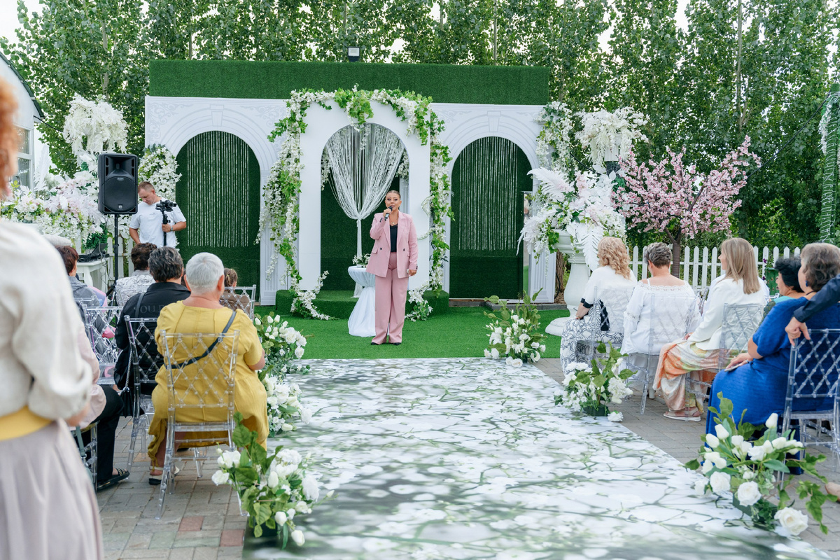 Зона регистрации расположена сразу напротив основного белоснежного шатра, в котором проходит само торжество.