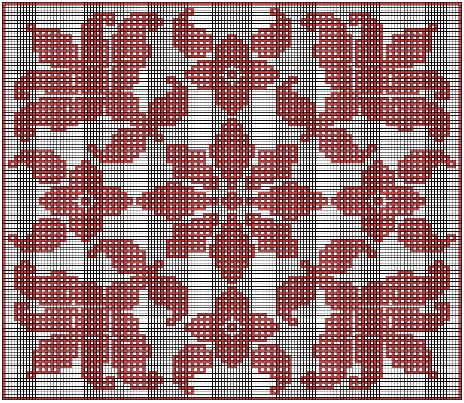 На этот раз, новая схема квадратного мотива в мозаичной технике вязания крючком получилась не просто большой, а очень большой. Первая схема составлена в комбинированной технике, то есть узор мотива сделан в «вафельной» технике, а фон - в «гобеленовой». Можно схему сделать и наоборот, поменять местами техники фона с узором, или полностью в «гобеленовой», но именно такое сочетание техник мне нравится больше всего. Вторую схему сделала полностью в «вафельной» технике , в самой популярной для таких узоров. Размер мотива получился 75 рядов. Вместе мотивы создают такой красивый растительный орнамент. Сделала также схему с крестиками, но из-за того, что схема очень большая, схему составила не как всегда, на одну четвёртую мотива, а на одну восьмую мотива, то есть вяжем как обычно до середины, после вяжем в зеркальном отражении. Центральный столбец выделила толстой рамкой, но её плохо видно, пометила ноликами в начале и в конце. Чтобы сделать ещё покрупней схему, разделили её на две части, пе