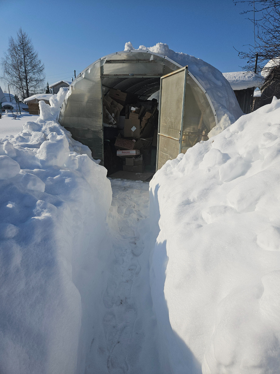 Вновь слабость проявила, не удержалась, прикупила. Супруг нагайку приподнял, напрасно воздух рассекал. При виде стеллажей глаза блестят, рукам покоя нет и разум заперт. Ну и ладно, пусть будет так! На день сегодняшний занятие одно - сбор по округе будущей еды: червям, растениям, и маленьким, а может и большим, грибам. Одна теплица под завязку. Всего четыре метра, дальше нет прохода из-за завала корма из картона. Пройду к другой, там есть ещё места, есть пустота. Но скоро ларчик будет полон. А, ещё одна, совсем пуста на первый взгляд, однако на второй - полна. Снегами и горшками. Межтепличное пространство. Покупки.