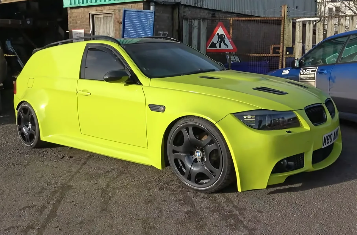Вторую жизнь автомобиль получил после ДТП. Разбитую машину, которая находилась далеко не в лучшем состоянии, приобрел британец Уэйд Эванс, владелец местной фирмы, торгующей автозапчастями. Он решил переделать универсал BMW 320d в кузове Е91 в грузовой фургон, установив сзади глухие панели. А чтобы придать машине более спортивный вид, заказал для нее обвес от M3 поколения E92. На удивление получился не Франкенштейн, а вполне гармоничный автомобиль с колесными дисками M, чуть модернизированной оптикой и прямоточным выхлопом, разведенным на две стороны. Фургон, задние двери с окнами у которого были заменены на глухие панели, выкрашен в ярко-салатовый цвет, салон при этом черный. От M3 ему также достались расширители крыльев, штатные бамперы заменили на реплики, а капот — на кастомный со встроенными вентиляционными отверстиями и фирменным выступом по центру. В движение машину приводит стандартный дизельный мотор объемом 2,0 литра, но дополненный новой турбиной и с перестроенным блоком упра