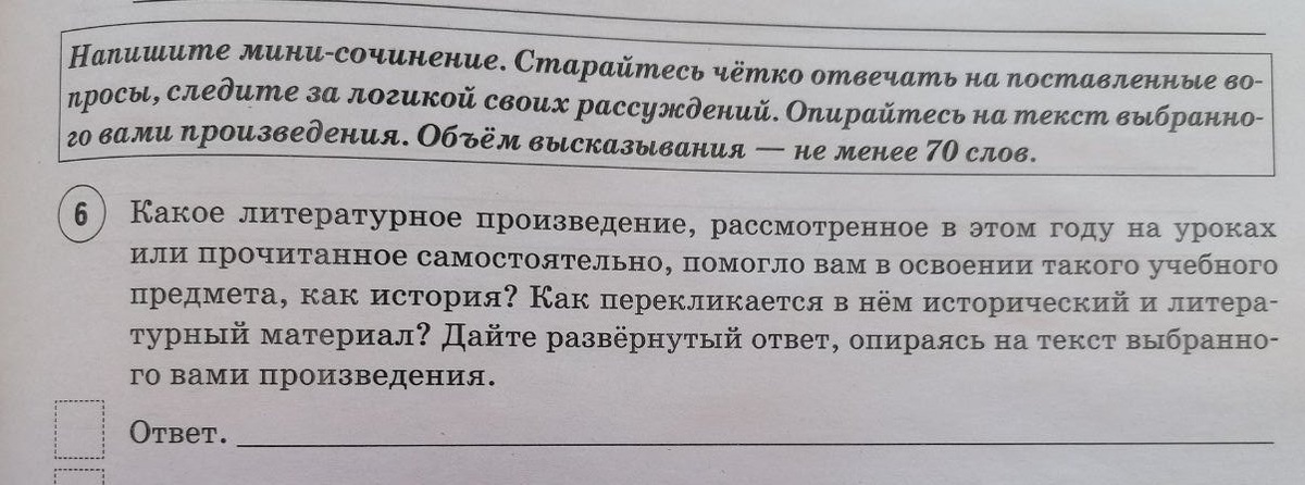 Какое литературное произведение, рассмотренное в этом году на уроках или прочитанное самостоятельно, помогло вам в освоении такого учебного предмета, как история? Как перекликается в нём исторический и литературный материал? Дайте развёрнутый ответ, опираясь на текст выбранного вами произведения. Многие литературные произведения являются источником для понимания истории нашей страны. Порой исторический и литературный материал переплетаются настолько, что создаётся глубокое и произведение, в котором отражаются как реалии времени, так и вечные человеческие темы. Одним из таким произведений является поэма Н.Некрасова «Княгиня Трубецкая». Поэма основана на реальных событиях, связанных с восстанием декабристов. Княгиня Трубецкая была первой из жён декабристов, добившейся разрешения выехать в Сибирь. Её примеру последовали и другие. Княгиня Трубецкая, как литературный образ, соединяет в себе черты как исторической личности, так и русской женщины, готовой на жертвы ради любви и Родины. Та