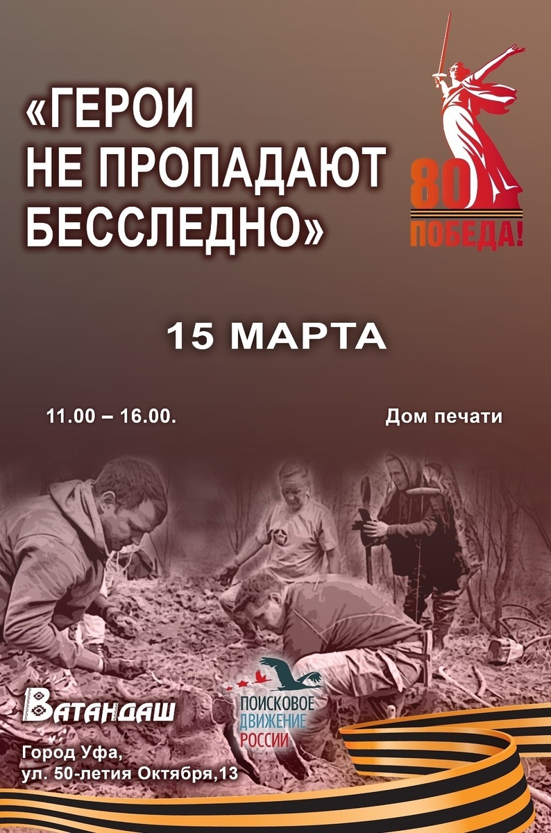 Редакция журнала «Ватандаш» проведет акцию «Герои не пропадают бесследно», посвященную 80-летию Победы, которая поможет в поиске пропавших без вести на фронтах Великой Отечественной войны. Цена Победы в Великой Отечественной войне высока: многие воины, не вернувшиеся домой, до сих пор считаются пропавшими без вести. Если вы хотели выяснить судьбу своего деда, прадеда и не смогли это сделать самостоятельно, приходите в уфимский Дом печати 15 марта с 11.00 до 16.00. Члены регионального отделения «Поискового движения России» в Республике Башкортостан помогут в поиске вашего родственника – героя.