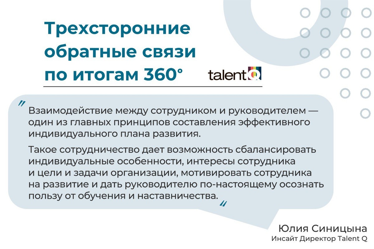 Особую ценность в 360 представляют трехсторонние обратные связи, на которых присутствуют: 🚀 HR (консультант), 🚀 оцениваемый сотрудник и 🚀 его непосредственный руководитель На встречах в таком формате есть возможность максимально вовлечь руководителя, найти новые важные темы для обсуждения и сразу продумать варианты развития ключевых компетенций и проекты, в которых это можно реализовать. Перед проведением трехсторонней обратной связи мы рекомендуем провести предварительную подготовительную встречу с руководителем. Ключевые аспекты, которые важно обсудить: 💳 Цели руководителя на встречу и его ожидания от обратной связи 360º. Часто бывает, что руководитель, инициируя 360º для сотрудника, имеет открытые и скрытые, недекларируемые цели. На предварительной встрече с руководителем важно провести подробную работу по выяснению его потребностей, понять его цели и задачи на обратную связь. Знание этих целей позволяет расставить дополнительные акценты на самой обратной связи. Например, руков