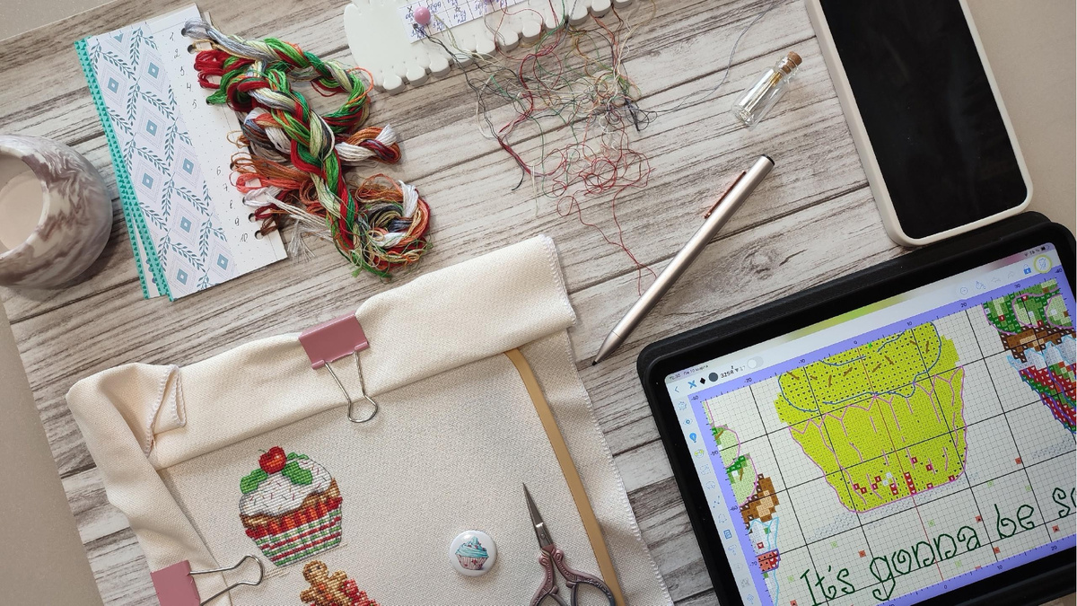 У меня нет отдельного рукодельного места, за которым я могу вышивать, а вышиваю я на кухне за обеденным столом. Иной раз я вышиваю за компьютерным столом, сидя в игровом кресле, которое, казалось бы, должно доставлять мне неимоверный комфорт. Я поняла, что мне намного комфортнее вышивать, сидя на твердом стуле с высокой спинкой, чтобы я могла облокотиться на нее, а не наклоняться над столом (к слову, мягкость сидения мне не так важна). Благо планшет, на который установлена Сага, я могу поставить так, как мне удобно, а стилусом закрашивать значки по схеме. И это первый пункт – удобное место для вышивки. Очень редко я вышиваю и сидя на кровати, а на прикроватную тумбу я кладу все необходимое для вышивки. Но именно за обеденным столом мне гораздо удобнее вышивать. И вы продумайте себе место, где вам было бы комфортнее: как расположить материалы для вышивки, какой стул использовать, как сесть, с какой стороны положить схему и т.д. (я уже не говорю о том, на чем вышивать: на раме, на пяльцах и т.д.).
