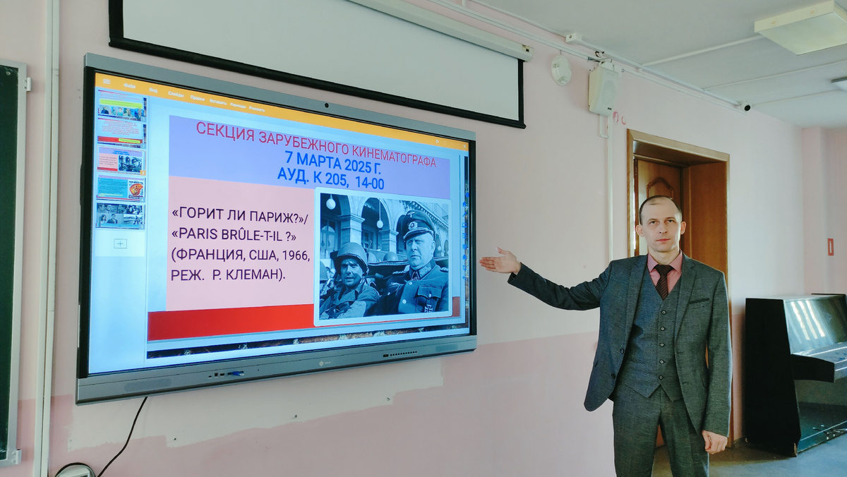 7 марта в аудитории К 205 состоялась работа секции зарубежного кинематографа в рамках научно-просветительского проекта кафедры истории и культурологии ИГХТУ «ИНТЕЛЛЕКТУАЛЬНЫЙ КИНОТЕАТР» (научный руководитель-консультант – д.и.н., доцент К.А. Юдин). Студентам была показана военная драма «Горит ли Париж?»/«Paris brûle-t-il?» (Франция, США, 1966, реж. Р. Клеман), сценарий которой основан на одноименном литературном произведении Д. Лапьера и Л. Коллинза, посвященном освобождению Парижа от нацистской оккупации в августе 1944 года. Особенностью имагологической фактуры данной картины является ярко выраженный ансамблево-корпоративный тип коммуникации, что выразилось в целой палитре образов, созданной классиками-мэтрами мирового кинематографа. На сценической площадке и затем в кинематографической «гиперреальности» встретились А. Делон, С. Синьоре, И. Монтан, Ж.-П. Бельмондо, К. Риш, М. Пикколи, Ж.-Л. Трентиньян, Б. Кремер, Б. Фрессон, О. Уэллс, Э. Перкинс, К. Дуглас, Г. Форд, Г. Фрёбе и многие