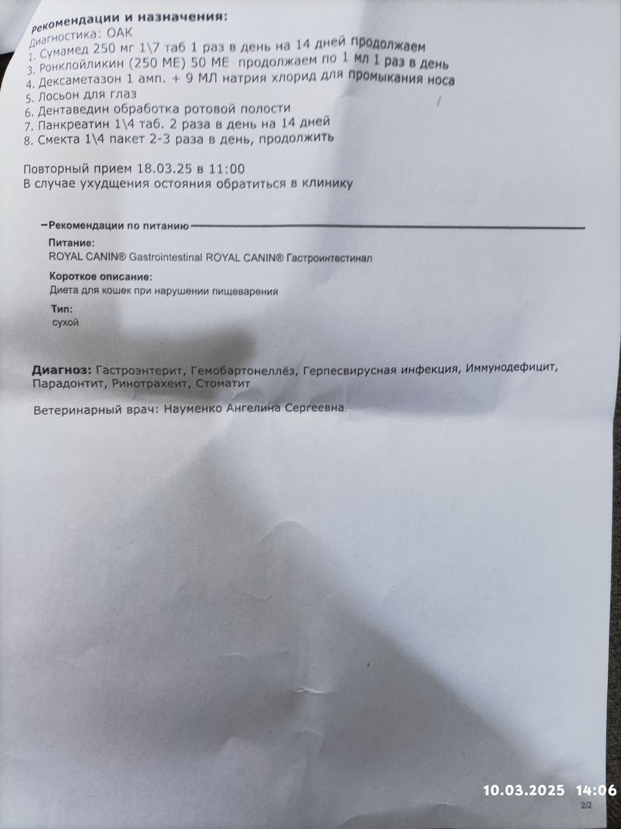 Привет! сегодня были с Гошей в Ветсити на очередном приёме.Лечение продолжаем, общий анализ хороший.Следующий визит 18 марта. Попросила кота взвесить ,вес не изменился,но хорошо что не снизился,а это уже хорошо.Спросила про то чтобы вырвать зубы,но пока ответили нельзя,у Гоши в пасти язвочки,нужно вылечить сначала пасть. Теперь напишу про Белку. Белка бездомная собака и её надо край стерилизовать,раньше она и ещё несколько других собак жили в частном секторе ,но потом как они загуляла их выгнали,одну из них стерилизовали и приютили на улице в частном секторе и всей улицей её кормят.Ну а Белка жила на Горняцком и пришла к нам весной,когда принесли её щенков,либо привезли.Кого то из щенков мы пристроили,а одну одни нелюди отравили.Белка очень осторожная собака и я спросила в ветлечебнице как можно бы её стерилизовать и мне дали таблетку Успокоин. Пожалуйста,помогите мне стерилизовать её, пожалуйста .Белка умница,хорошая охранница,людей не обижает,но щенков потом будет девать некуда .