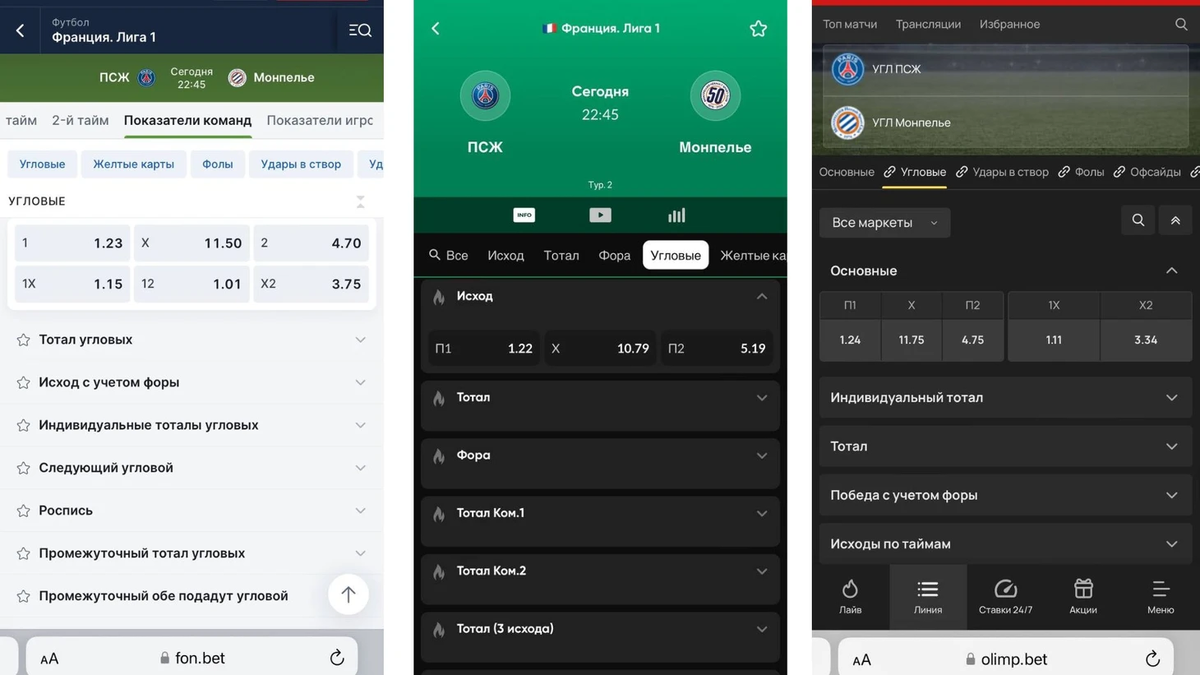 - Индивидуальный тотал — количество угловых заработанных одной из команд.