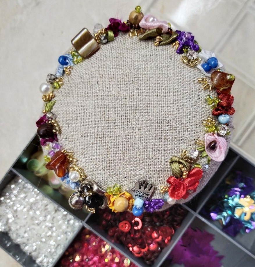 Разбирала лоханки для текущих проектов, в которых накопились обрезки. Нашёлся мешочек с миксом из бусин и бисера, залежался лоскуток льна - и вот. Единственное, за чем вышла в другую комнату, были бобинки от скотча - они несколько лет лежали на всякий случай. :)