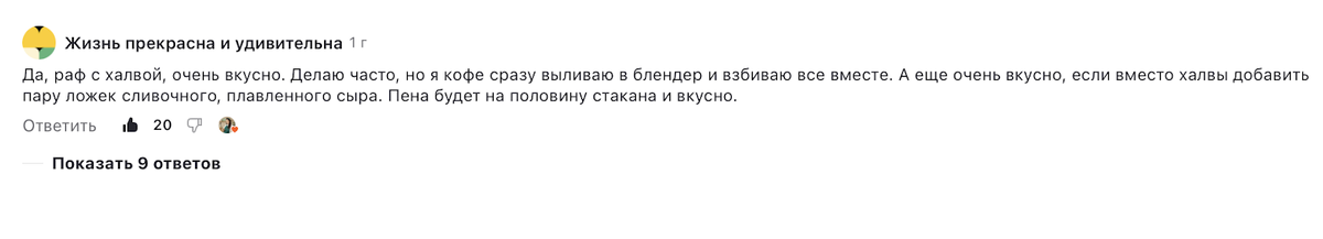 Ваши комментарии часто вдохновляют меня пробовать что-то новое. Иногда я полностью готовлю по вашим рецептам (которые вы оставляете в комментариях), а иногда беру вашу идею за основу и добавляю свои штрихи. Это всегда так здорово! Ведь столько в мире интересных блюд, как хочется всё-всё-всё попробовать! И даже обычный кофе в каждой семье готовят по-разному. Хотя казалось бы, что тут еще можно придумать? И вот, история: снимали мы рецепт вкуснейшего кофе с халвой. Вот он: И среди десятков комментариев с возмущениями “А ЗАЧЕМ ВООБЩЕ ЭТО ПИТЬ”, читатель поделился рецептом еще более интересного напитк – кофе с плавленным сыром. У меня не осталось выбора, нужно было и его попробовать! Уважаемый читатель, спасибо вам большое за этот рецепт! 💙 Посмотрите, какая же получается красота: Видеорецепт есть у меня в телеграме (вот ссылка). Уточню, что мы не пьем такой кофе каждый день, конечно же. Этот напиток можно воспринимать как изысканный десерт и готовить его только тогда, когда очень хочетс