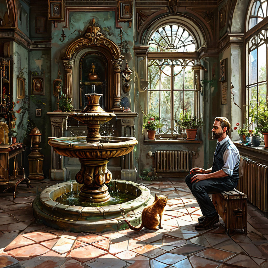 Прямо посреди огромной комнаты с неправильными углами и большим окном в деревянной, покрытой трещинами раме, стоял каменный фонтан в виде печального юноши с цветом в руке.