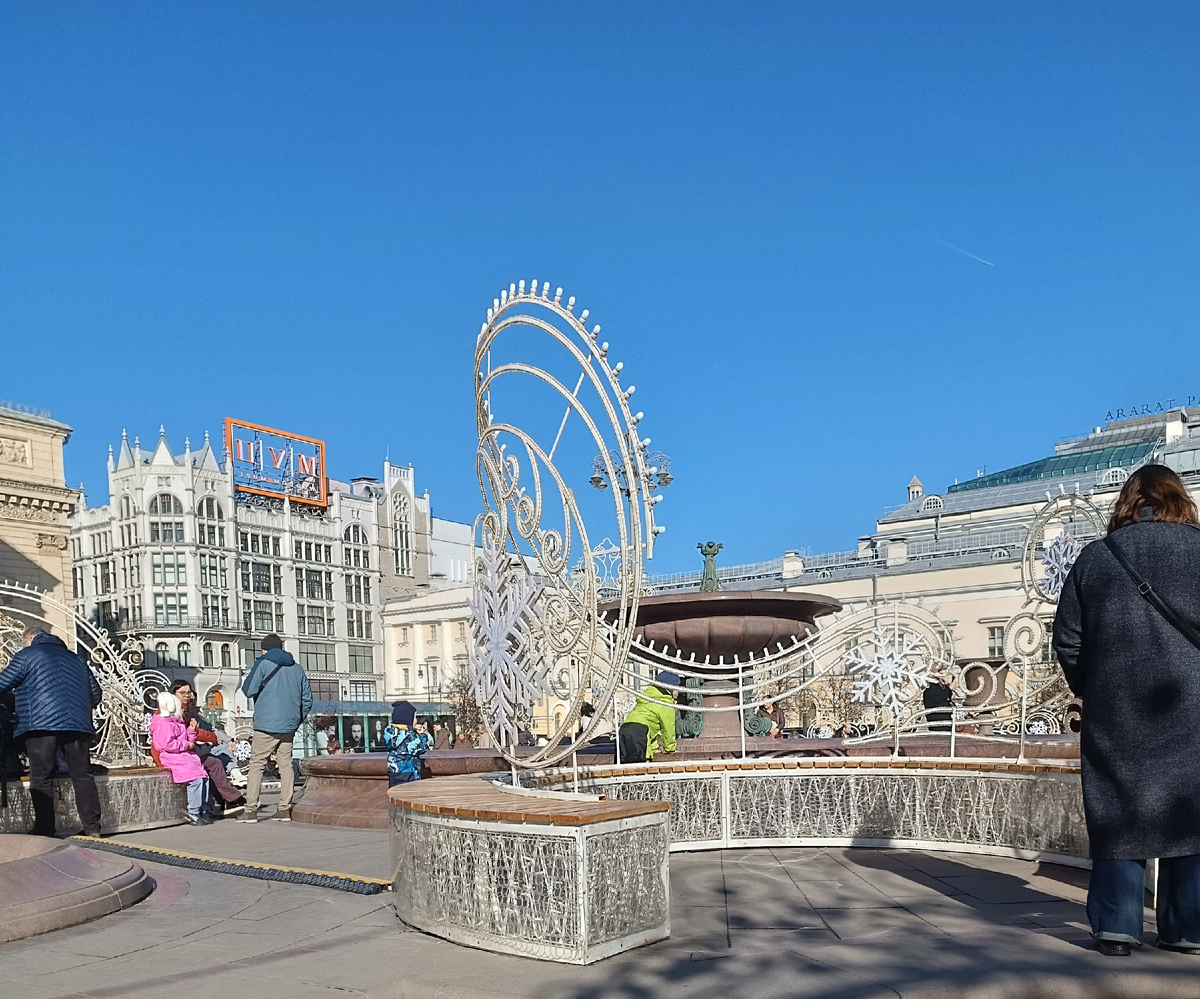 11 марта 2025 года Здравствуйте, друзья! В прошедшие праздничные выходные оказалась я случайно в сквере у Большого театра. Вообще-то путь мой лежал в Петровский Пассаж, где проходила выставка цветов. Но мимо сквера пройти было сложно. Мне тогда убранство этого места показалось немного странным. Вместо весеннего многоцветья белые арки, довольно красивые, но что-то в них не так. И только на следующий день, когда снова оказалась в том же сквере, но уже попозже, перед началом спектакля в театре Оперетты, поняла, что меня насторожило. День клонился к вечеру, зажглась подсветка, и при её свете ясно обозначились на арках новогодние снежинки. То есть, не хватило дизайнерам трёх месяцев зимы, чтобы порадовать москвичей и гостей столицы новогодним убранством, решили прихватить ещё и месяц весны. Ну что ж "я художник, я так вижу!". А по мне так можно было это всё и снять. Весна! Памятная табличка рассказывает о том, что в сквере должны быть зелёные насаждения. С момента празднования 850-летия Мо